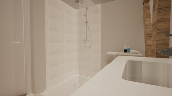 De badkamer is modern ingericht en voorzien van een douche, een dubbele wastafel met spiegel en een wasmachineaansluiting. Daarnaast is er een aparte toiletruimte met een wandcloset met fontein, wat extra gemak biedt.